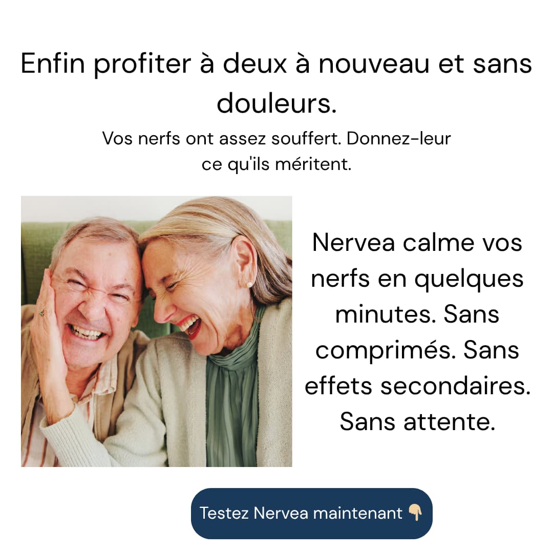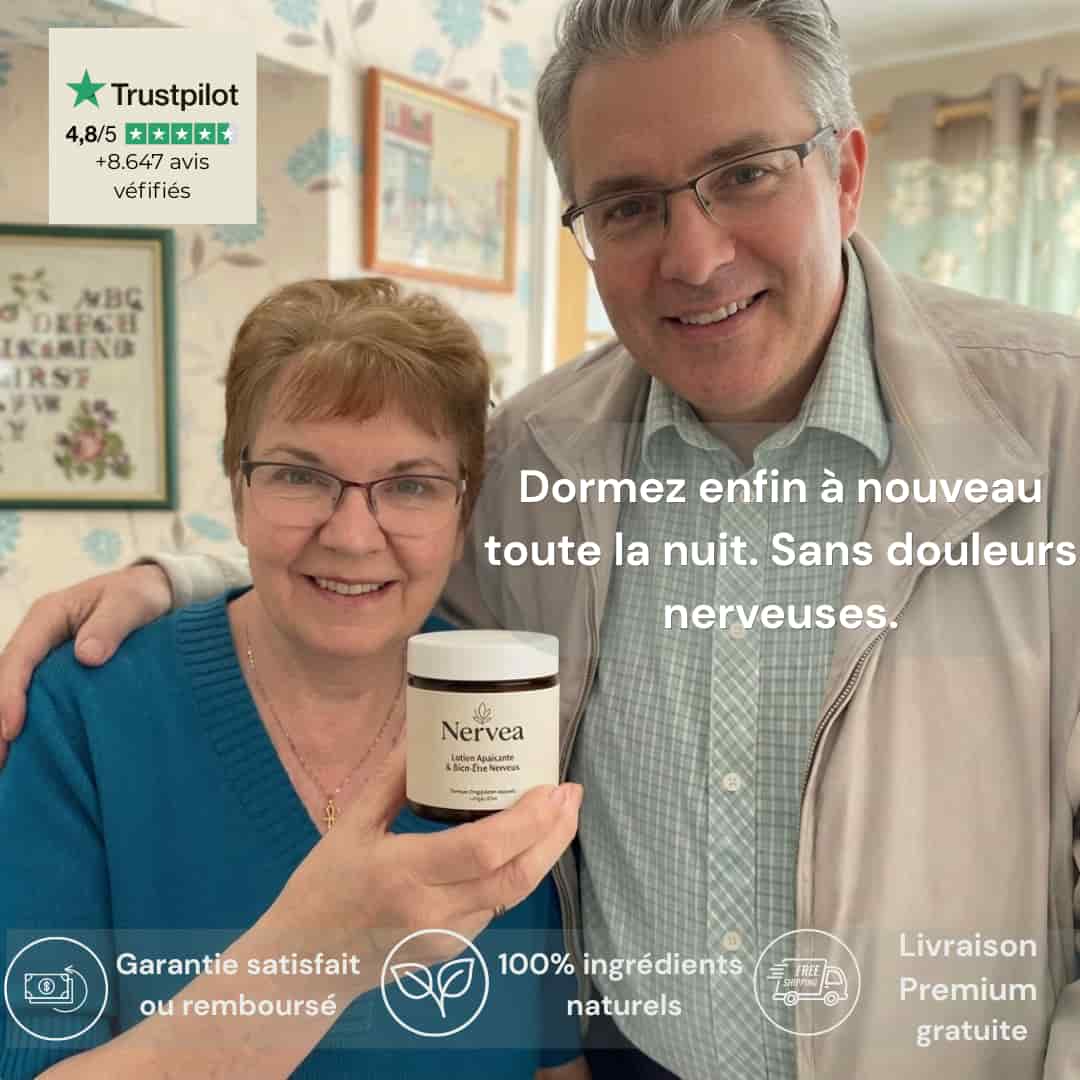 « J'utilise cette lotion depuis plusieurs mois et elle m'aide chaque jour. Il n'y a pas de remède miracle pour ce que je traverse — juste du soulagement. Cette crème me calme énormément et elle est 100% naturelle. Elle favorise la circulation et apaise les nerfs. Je l'applique matin et soir. Je dors enfin à nouveau. Merci Nervea ! »